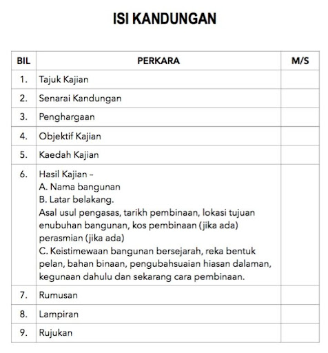 Tajuk tajuk kajian senarai kandungan penghargaan objektif kajian kaedah kajian hasil kajian maklumat asas produk tempatan. Di antara objektif tersebut adalah seperti . Ini dapat membantu kalian dalam menulis karangan kerja kursus sejarah pt3. Ini bagi membantu anda pelajar tingkatan 3 menyiapkan tugasan kajian kes yang diberikan . Moga ianya boleh dijadikan panduan berguna buat pelajar tingkatan 3 dalam menyiapkan isi kandungan tugasan kerja kursus/ folio sejarah tahun ini.